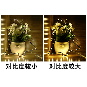 对比度: 又称反差度,指一幅画面中最亮的白色区域和最暗的黑色区域之间不同亮度层级的测量。差异范围越小,对比度越小;差异范围越大,对比度越大。
