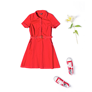 平铺白底服装的拍摄在搭景方面很简单,只需要有单色背景即可。在这里要注意背景颜色的运用,背景的颜色不能和衣服的颜色相同或太接近,如果太过接近,产品和背景的颜色无法形成对比,也就没有主体和背景之分,同时想要通过后期调整也比较难。相反,如果主体和背景颜色反差较大,这样就能很好地突出主体,主体边缘也会比较清晰,同时也方便后期抠图。