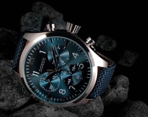这是一款在人造光下拍摄的极具吸引力的产品照片,其中手表的纹理和钟面设计是其主要卖点。